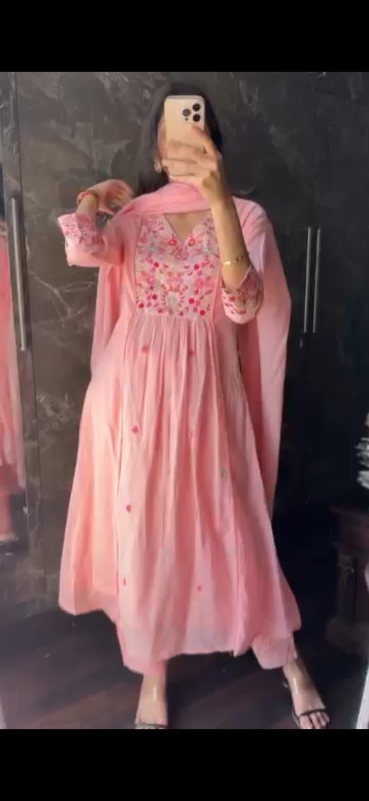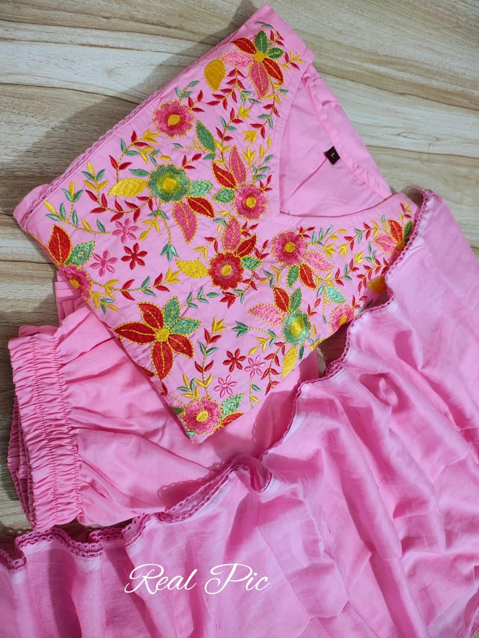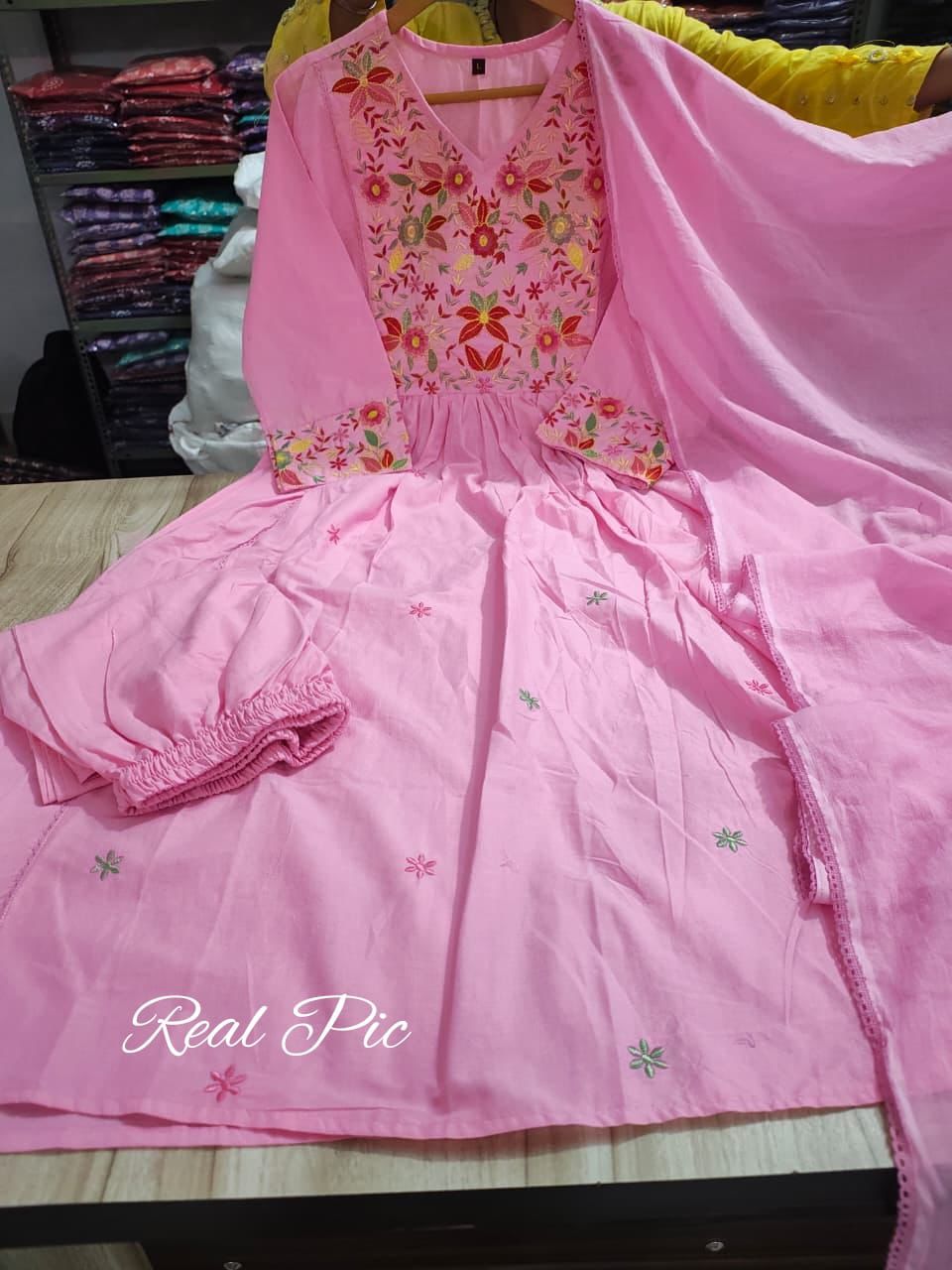 Make every occasion special with this beautifully crafted cotton Anarkali set designed for timeless elegance. The pure cotton kurti (46+ length) is adorned with delicate floral embroidery all over, highlighted with lace detailing and intricate thread embroidery on the yoke and sleeves for a graceful touch. Paired with a solid cotton bottom and a 2.1 mtr cotton dupatta, this ensemble blends comfort with sophistication – perfect for festive celebrations, family gatherings, or everyday elegance.