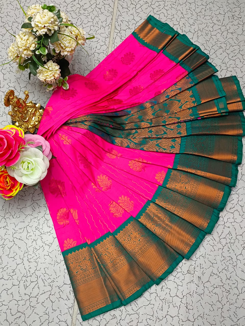 Elegantly woven chittu pallu and rolling pallu enriched with a touch of pink copper zari, adding a regal finish to the drape.