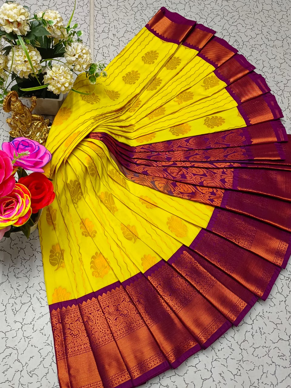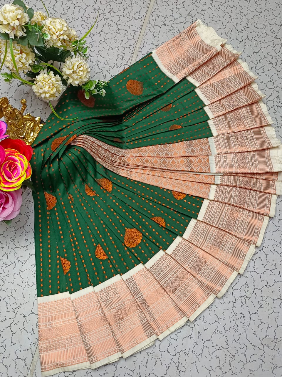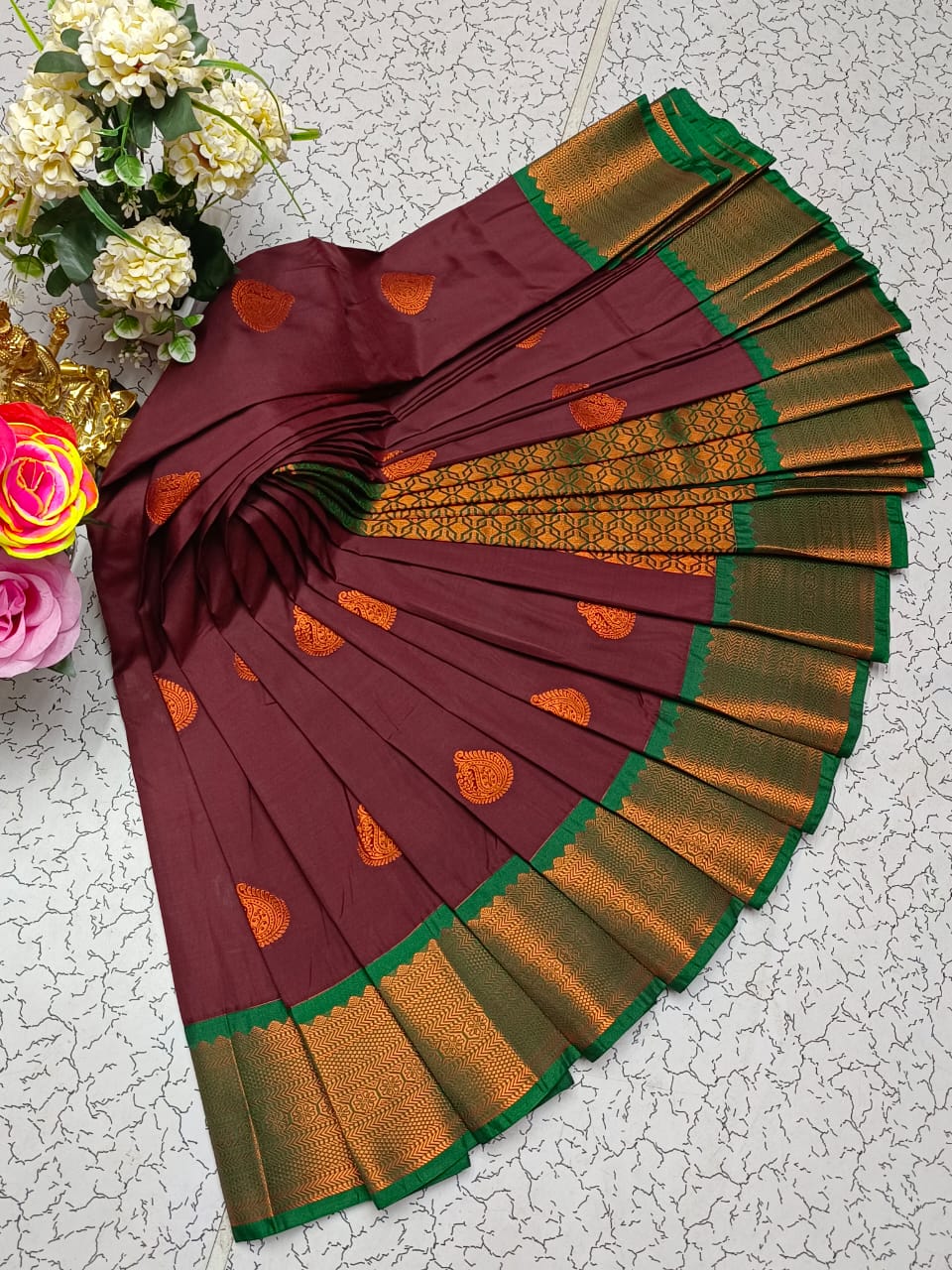 Pure Korvai silk with self-designed royal buttas woven into the body, offering a graceful texture and soft drape.