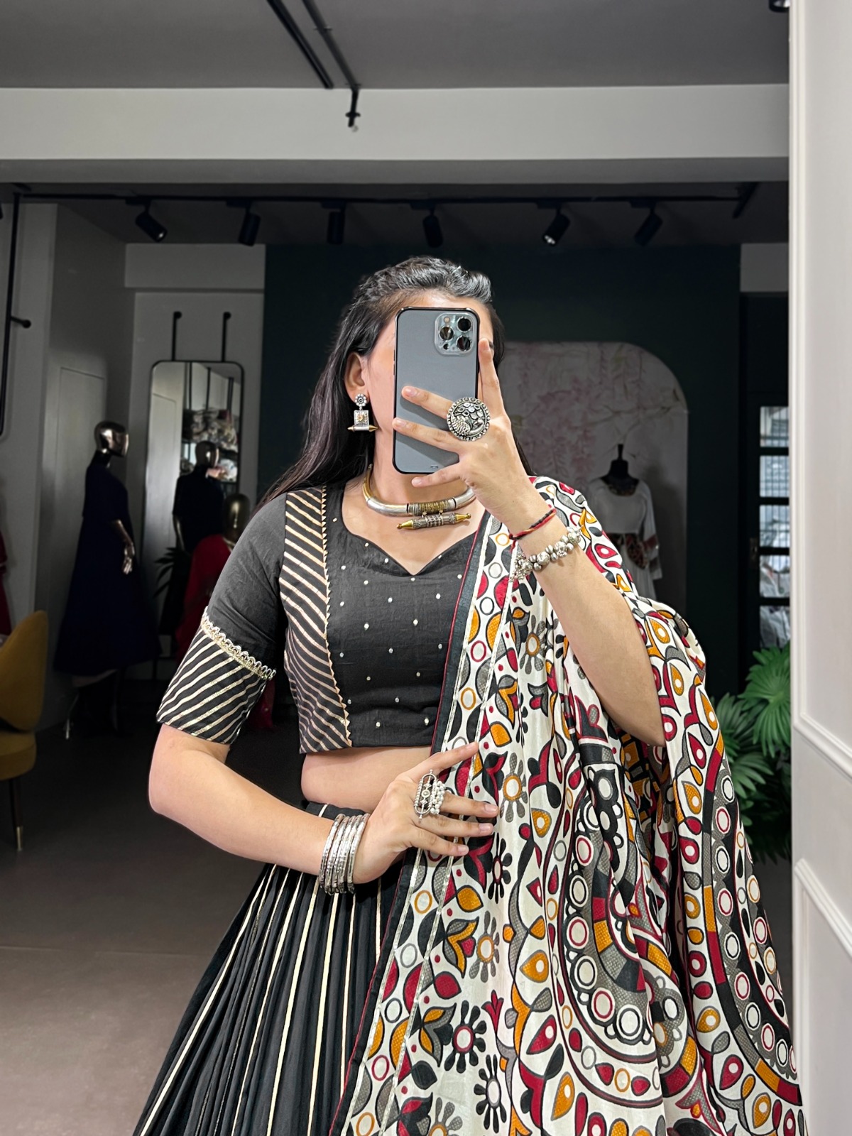 Lehenga (Stitched): Crafted in pure Chanderi with zari weaving and embossed lace detailing, stitched with canvas and full inner for added comfort. With a 5-meter flair and adjustable waist (up to 42”), it offers a regal look for every occasion.