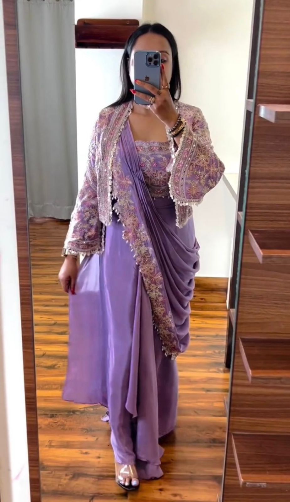 The look is elevated with a fully embroidered Chinon koti, adorned with fancy lace and tailored for a perfect structured fit. Paired with a heavy embroidered, fully stitched blouse, this ensemble blends contemporary fashion with traditional craftsmanship—ideal for weddings, festive occasions, cocktail parties, and special events.
