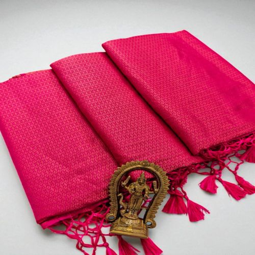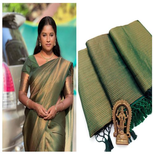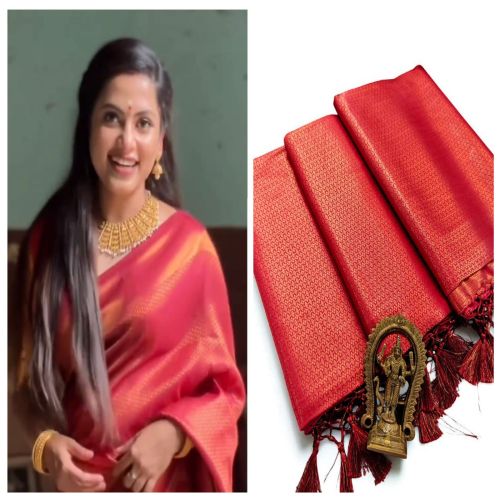 Step into timeless elegance this wedding season with our Copper Softy Saree, crafted to perfection in luxurious soft silk fabric. Designed for grandeur, this saree is adorned with copper zari weaving that adds a rich, regal charm.